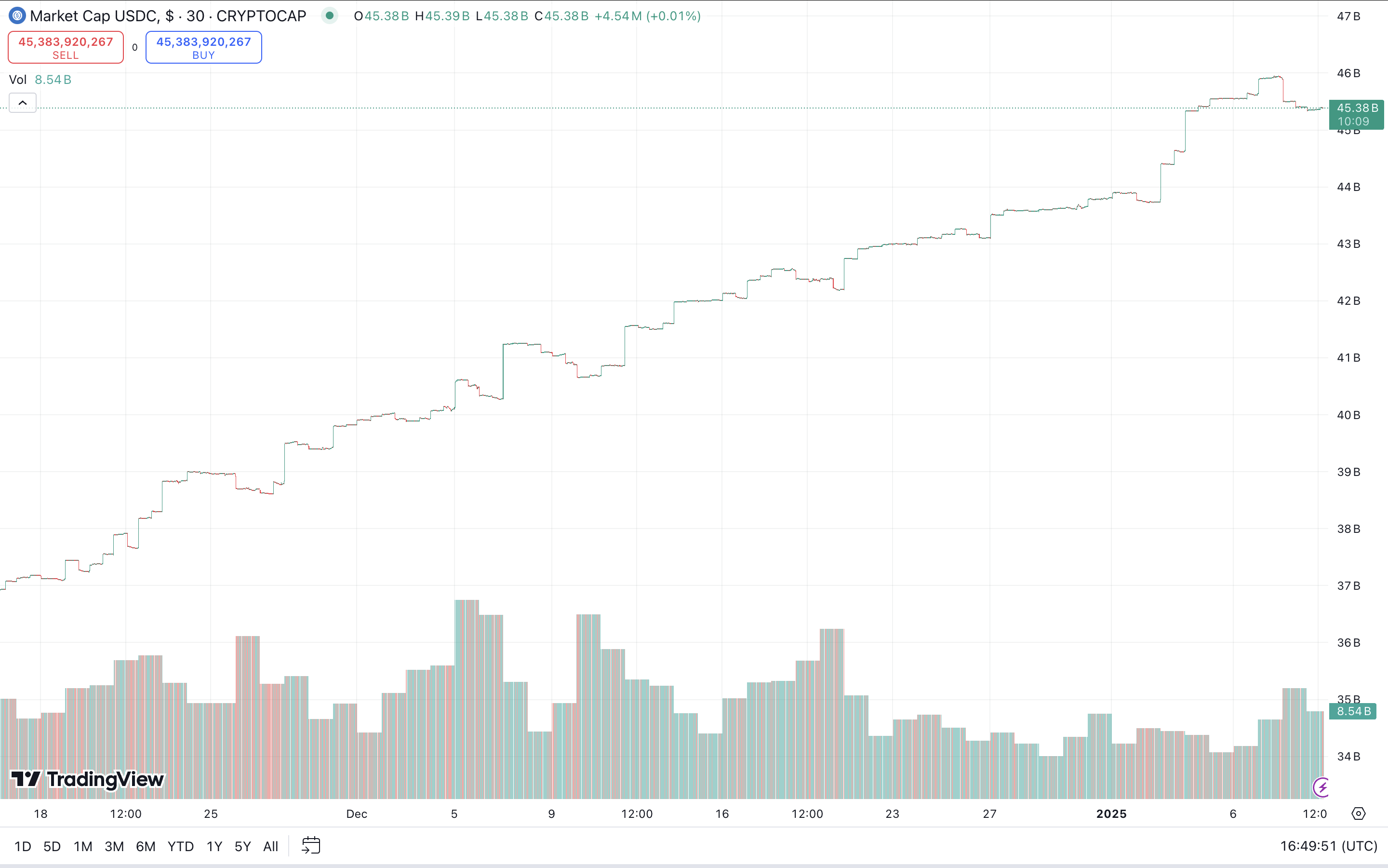 USDC:n markkina-arvo on kasvanut vähitellen Trumpin uudelleenvalinnan jälkeen. Jatkuva härkämarkkina lisäsi stablecoinien kysyntää markkinoilla, ja Yhdysvaltalaiset yritykset hyötyivät suuresti sääntelyoptimismista.