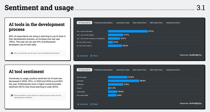 Kyselyt osoittavat, että muutos tuntuu vahvasti kehittäjätasolla. Stack Overflow 2025 Developer Survey -kyselyn mukaan 84 % vastaajista sanoi jo käyttävänsä tekoälykoodityökaluja tai suunnittelevansa niiden käyttöä, ja yli puolet raportoi päivittäisestä käytöstä. Erityisesti yli 40 % tekoälyä käyttävistä kehittäjistä sanoi, että vähintään puolet heidän koodipohjastaan on nyt tekoälyn tuottamaa.