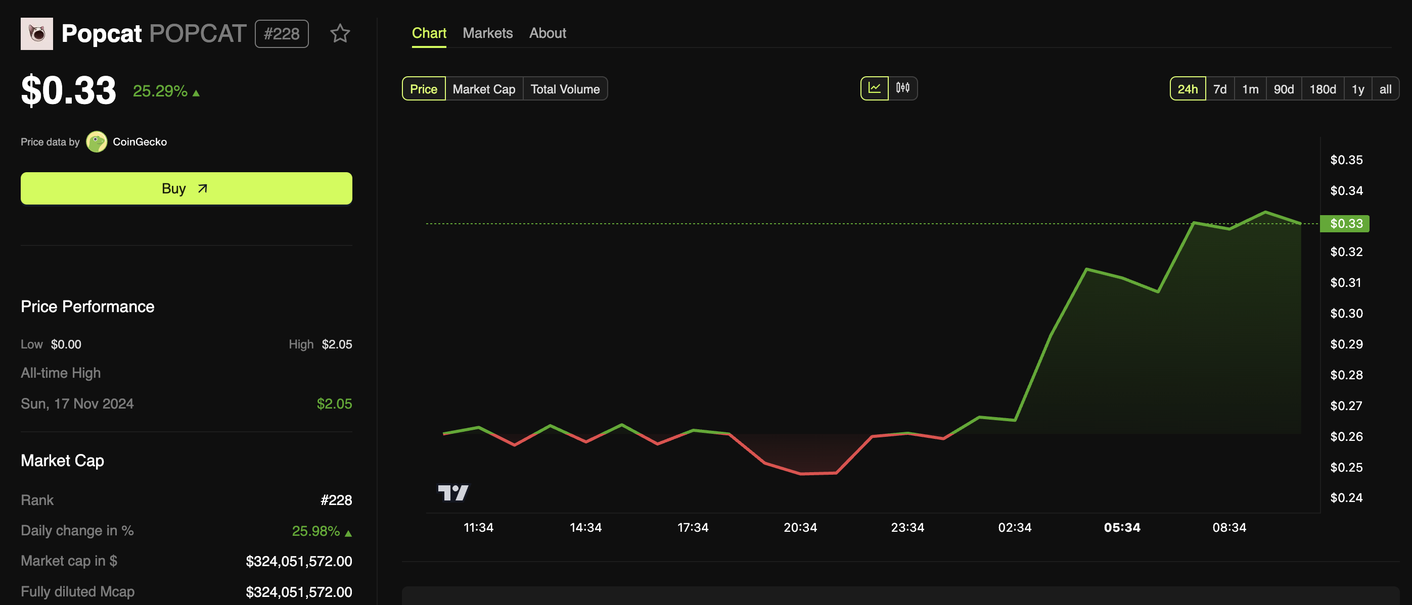 Kahdesta tokenista POPCAT johti nousua, nousten yli 25%. Ottaen tämän huomioon, sillä meemikolikko oli ollut laskusuunnassa marraskuusta lähtien.