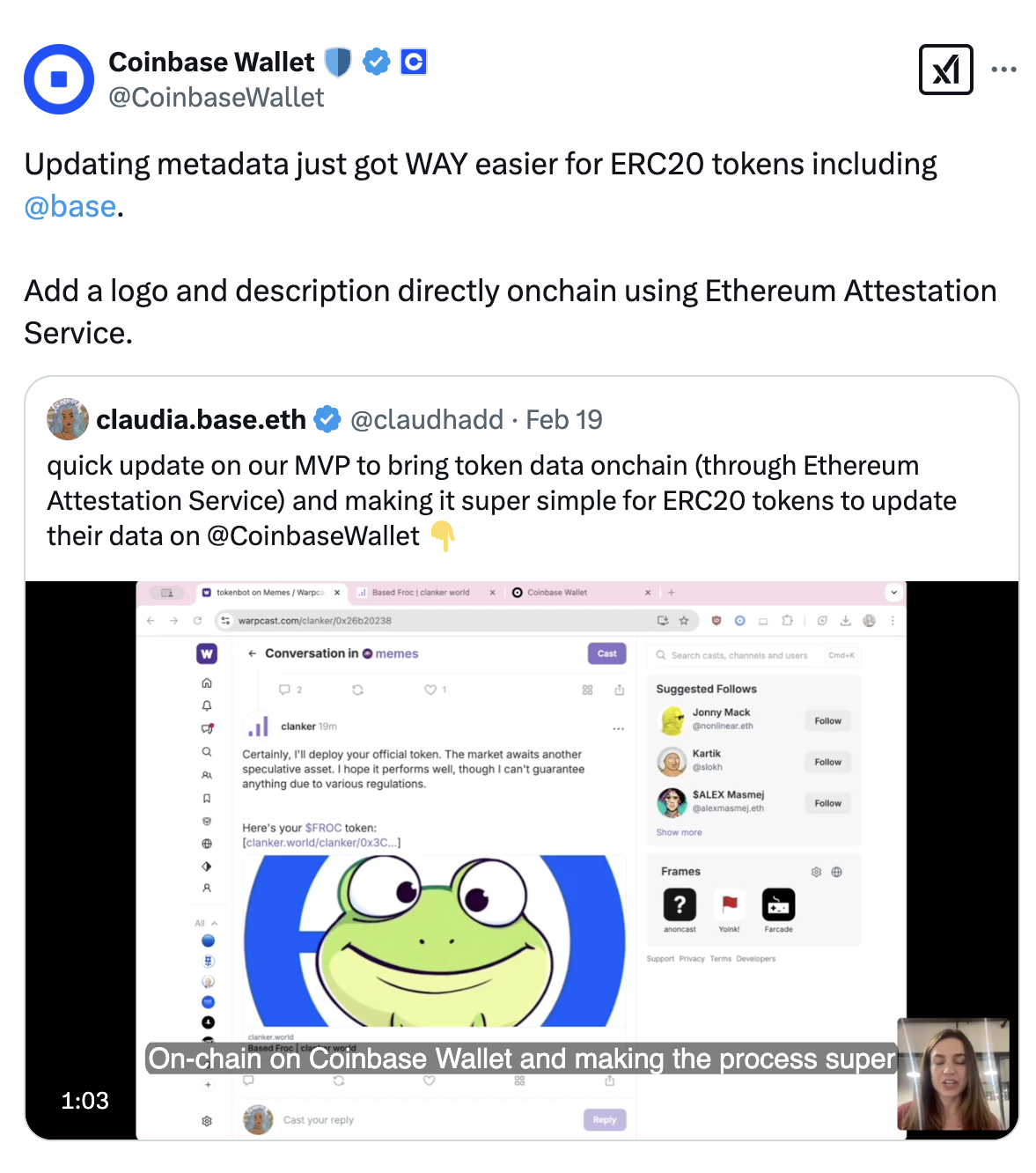 Eilen Claudia Haddad, projektipäällikkö Coinbasessa, jakoi opetusvideon, joka osoittaa, kuinka tuoda token-tietoja lohkoketjuun. Opetusvideossa käytettiin FROC:ia esimerkkinä. Meemikolikko lanseerattiin Clanker-alustan kautta.