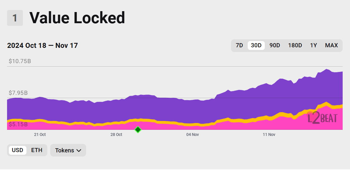 Basen nopea nousu ei ole yllätys. Verkko on nopeasti tullut nopeimmin kasvavaksi Ethereumin layer-2 ratkaisuksi, ohittaen kilpailijat kuten Optimism ja Arbitrum. CoinGeckon äskettäinen raportti sijoitti Basen toiseksi suosituimmaksi lohkoketjuksi vuonna 2024, ja verkko nyt kerää yhdeksän kertaa enemmän kiinnostusta kuin lähin Layer-2-kilpailijansa, Arbitrum.
