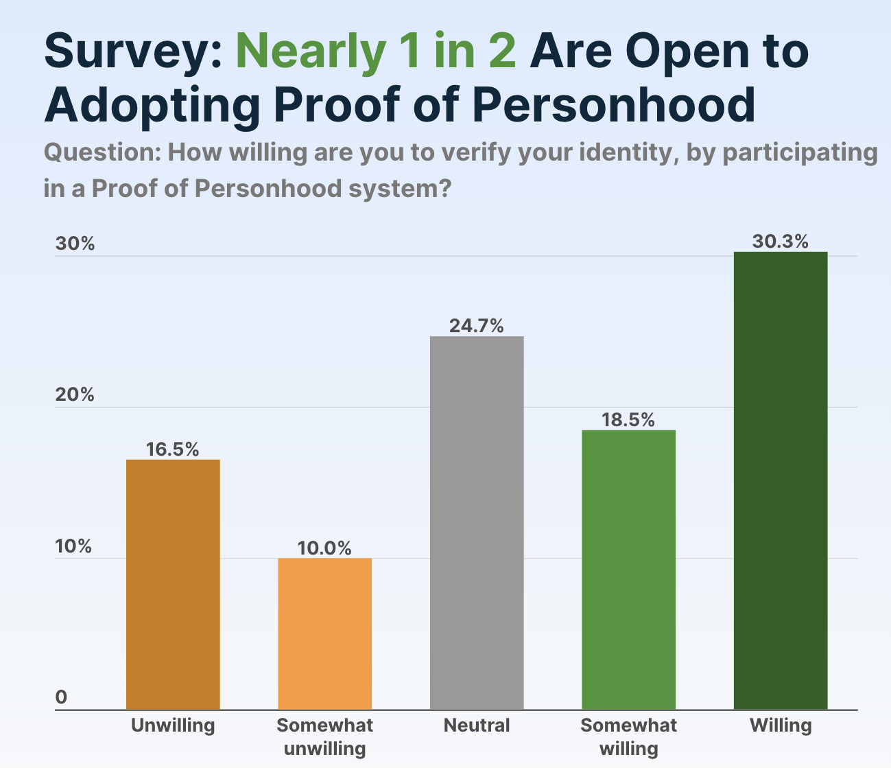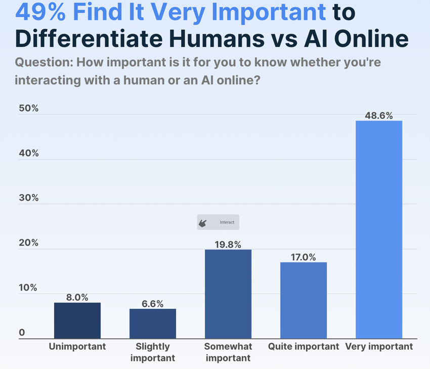 Kyselyssä todettiin lisäksi, että vain 30,3% vastaajista uskoo, että on erittäin tärkeää erottaa ihmiset AI:sta ja on myös valmis ottamaan käyttöön Proof of Personhood -menetelmiä.