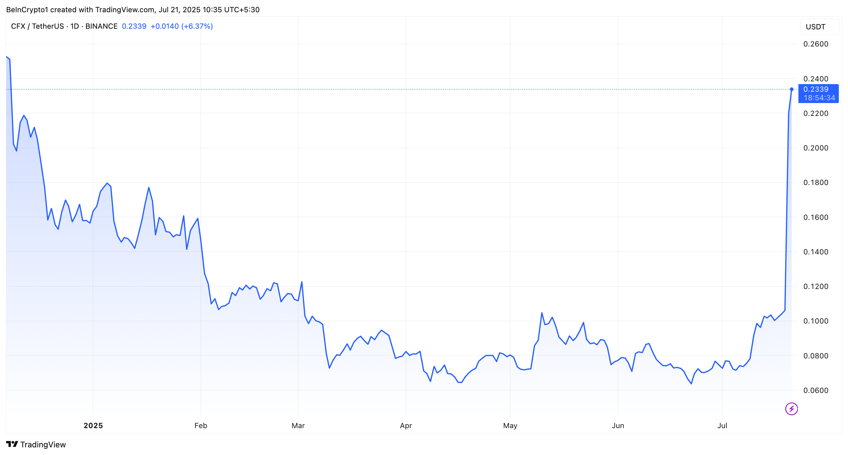 Viimeisen 24 tunnin aikana altcoinin arvo on noussut 105,4 %. Kirjoitushetkellä CFX:n hinta oli 0,23 dollaria, mikä on korkein hinta sitten joulukuun 2024.
