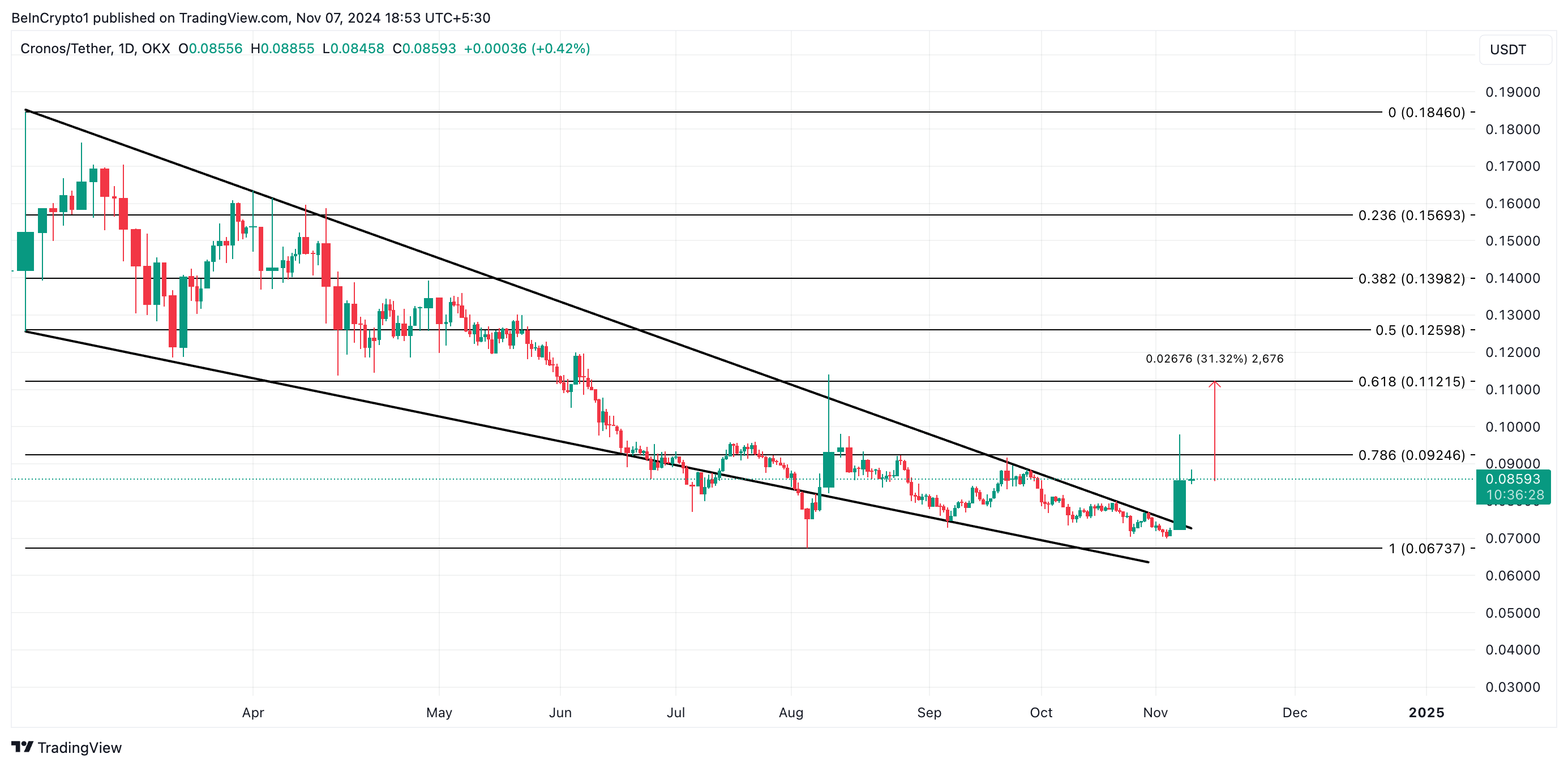 Cronos (CRO) on äskettäin murtautunut pitkäaikaisesta laskevasta kiilakuvioista, jossa se on käynyt kauppaa saavutettuaan vuoden korkeimman hinnan 0,18 dollaria 5. maaliskuuta.