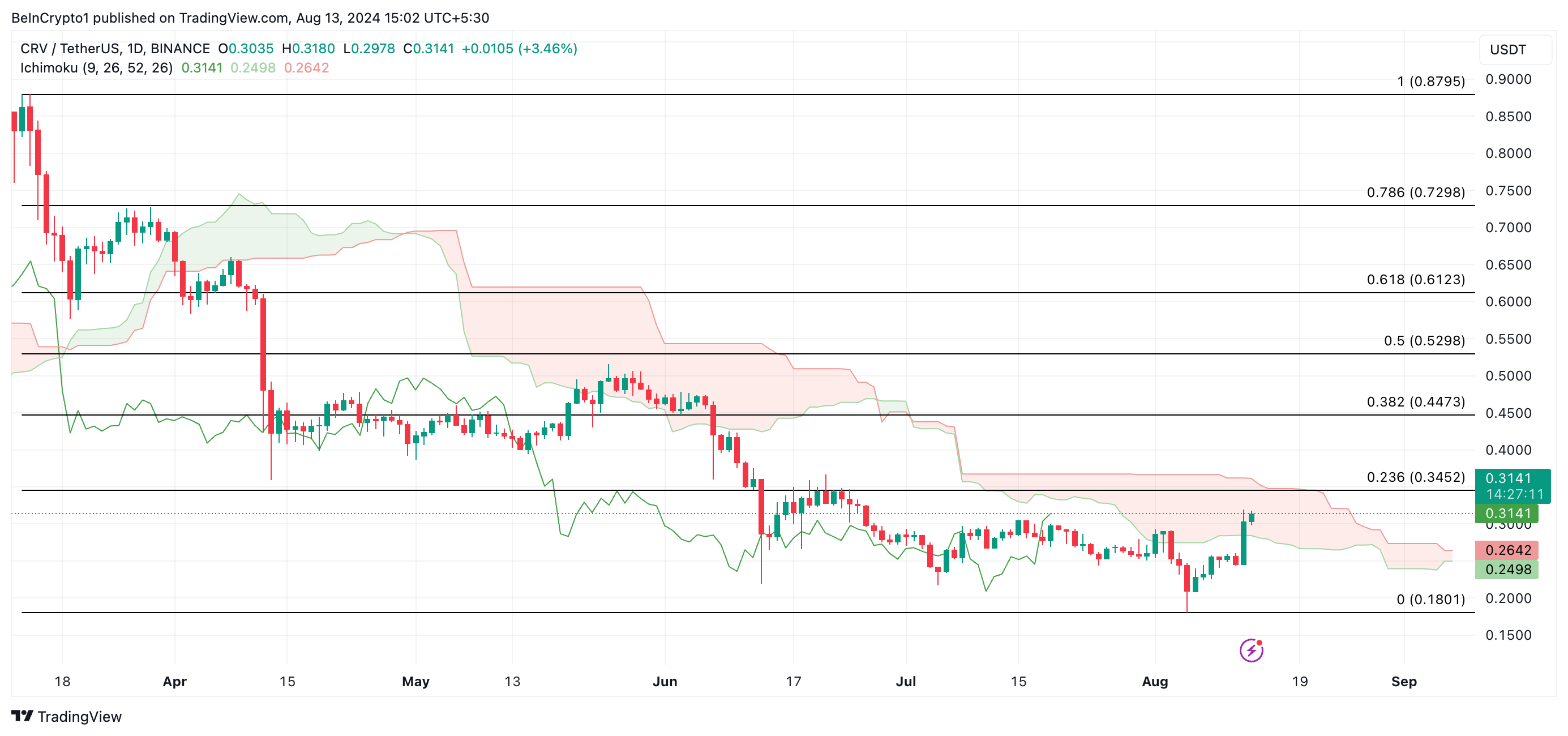 Kuitenkin, jos markkinatunnelma muuttuu härkämäisestä karhumaiseksi, se aiheuttaa hinnan laskun Ichimoku-pilven alapuolelle. Jos näin käy, CRV vaihtaa omistajaa 0,18 dollarin hintaan.