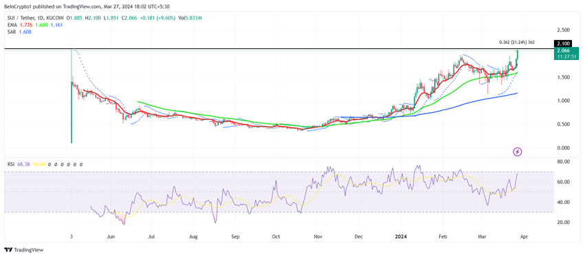 Sui on 100 kryptovaluutan top 100 -listan altcoin, joka on lähimpänä uuden kaikkien aikojen ennätyksen painamista. Altcoin yritti sitä viime kuussa, mutta epäonnistui vain todistaessaan 21 prosentin nousua viimeisen 48 tunnin aikana. Tämä ralli on tuonut sen lähemmäs edellistä 2,10 dollarin huippua, joka nähtiin toukokuussa 2023.