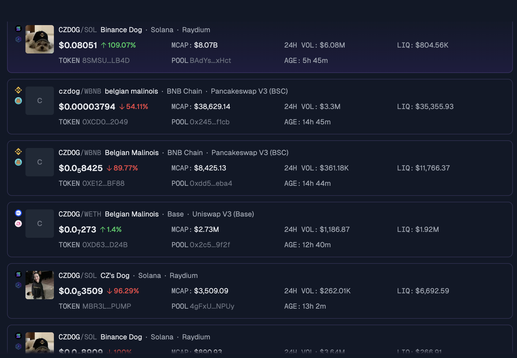 Vaikka CZ ei ole vielä jakanut mitään, useita meemikolikoita on jo luotu. Yksi näistä tokeneista, Binance Dog (CZDOG), nousi 109%. Lisäksi meemikolikon markkina-arvo saavutti 8,0 miljardia dollaria vain viisi tuntia sen lanseerauksen jälkeen.