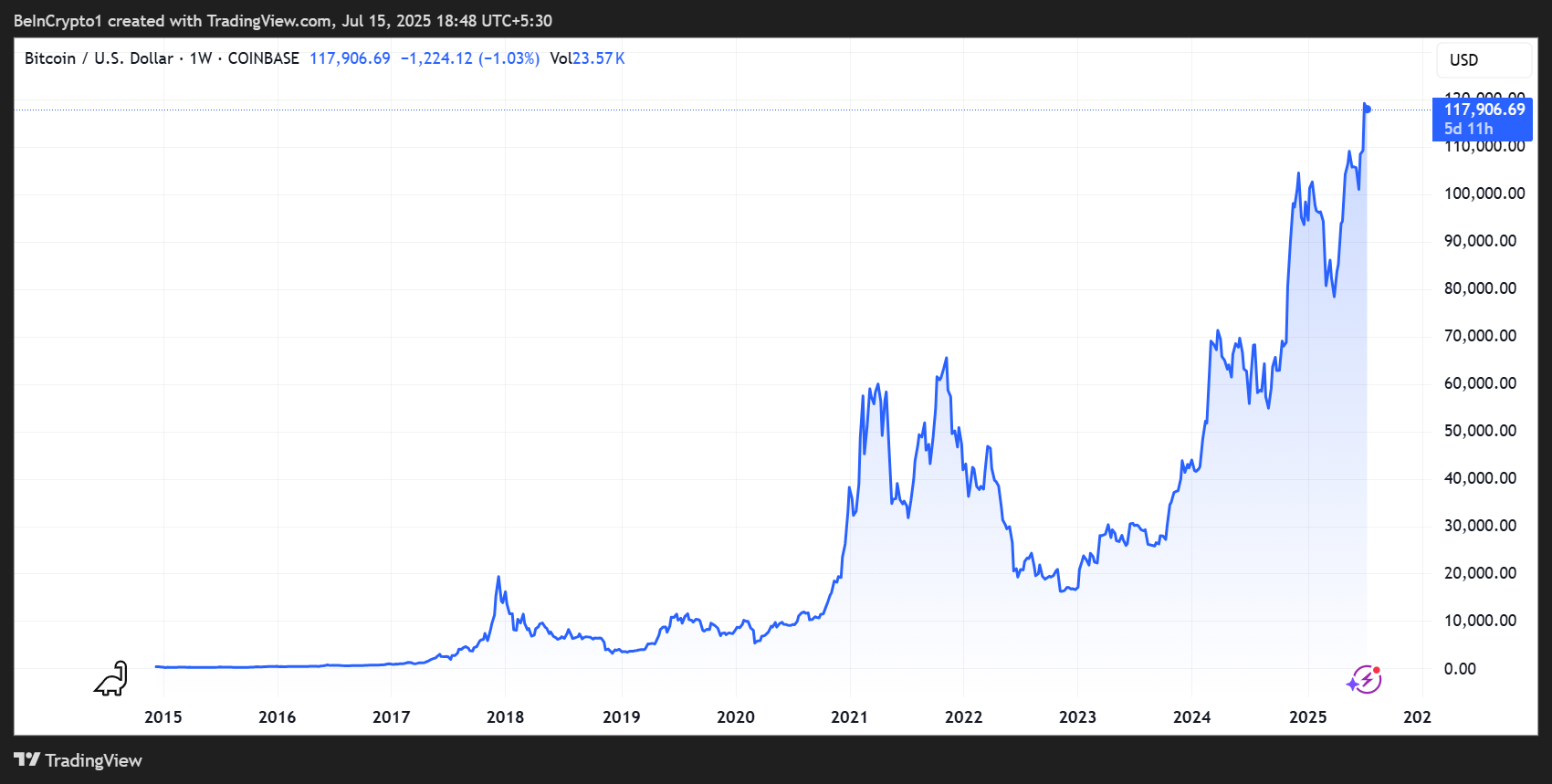 Tätä kirjoitettaessa Bitcoinin hinta oli 116 958 dollaria. Jos Jeremien ennuste pitää paikkansa, BTC:n hinta voisi nousta yli 327 % seuraavien viiden vuoden aikana.