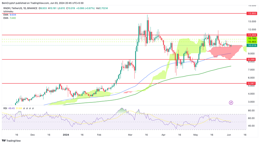 Renderin (RNDR) arvo on tällä hetkellä 10,01 dollaria. Tärkeimmät vastustasot ovat 10,78, 11,30 ja 13,99 dollaria. Nämä tasot merkitsevät merkittäviä kohtia , joissa hinta on aiemmin kamppaillut murtautuakseen. Tukipuolella välitön tukitaso on 9,03 dollaria, mikä näkyy EMA-linjalla.