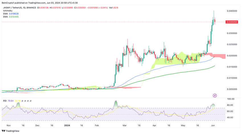 Jasmy on noussut 100 % toukokuun 26. päivästä nykypäivään, mikä johtaa yliostettuun tilaan. Odotamme korjausta 0,027–0,030 dollarin vaihteluväliin, ja 4H Ichimoku -pilvi on keskeinen tarkkailtava taso. Vaikka nousutrendi voi jatkua, nykyisiin hintoihin sijoittaminen on riski.