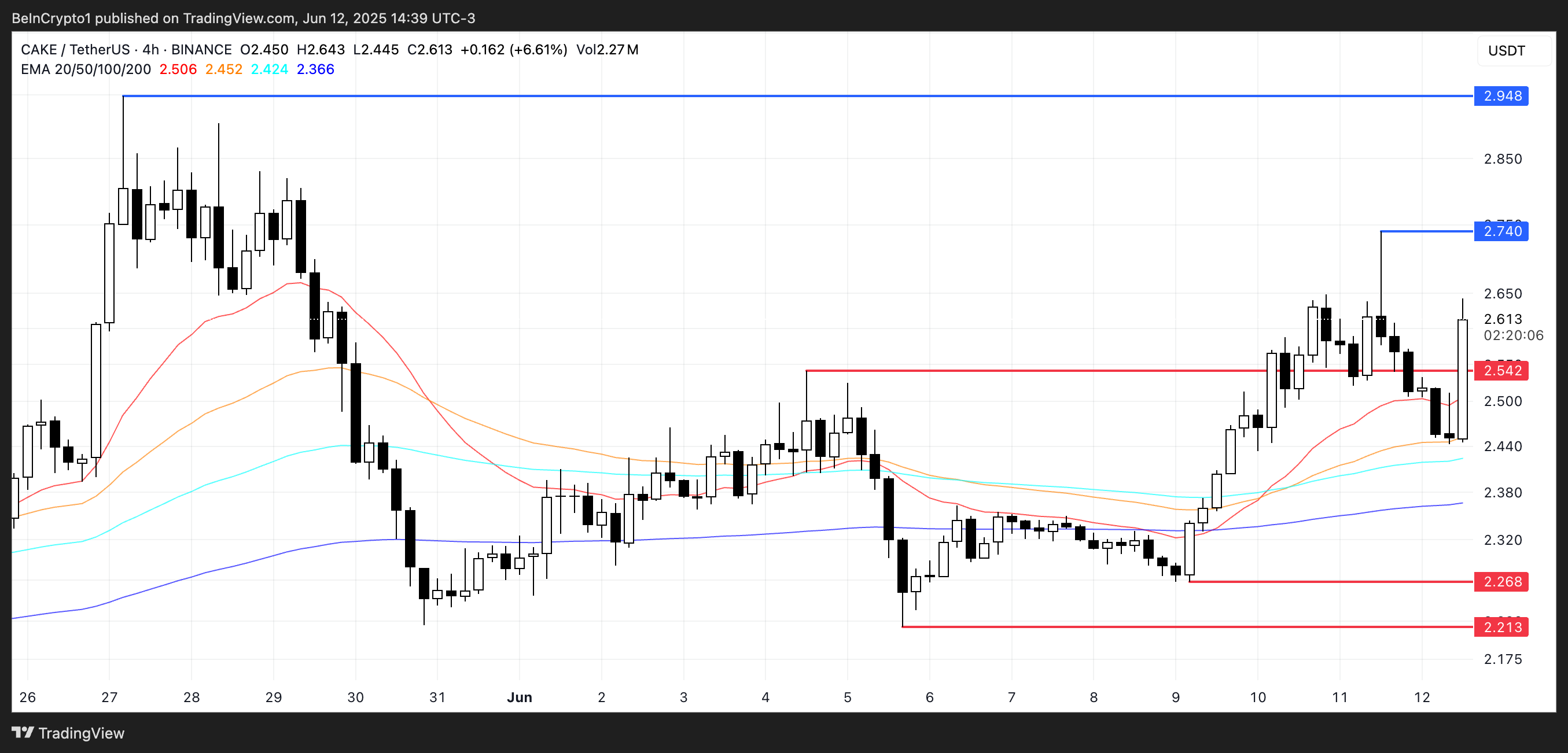 Jos tämä suuntaus jatkuu, CAKE—alustan oma token—voisi nousta korkeammalle testatakseen vastustasoa 2,74 dollaria ja mahdollisesti 2,94 dollaria, jos nousutrendi vahvistuu.