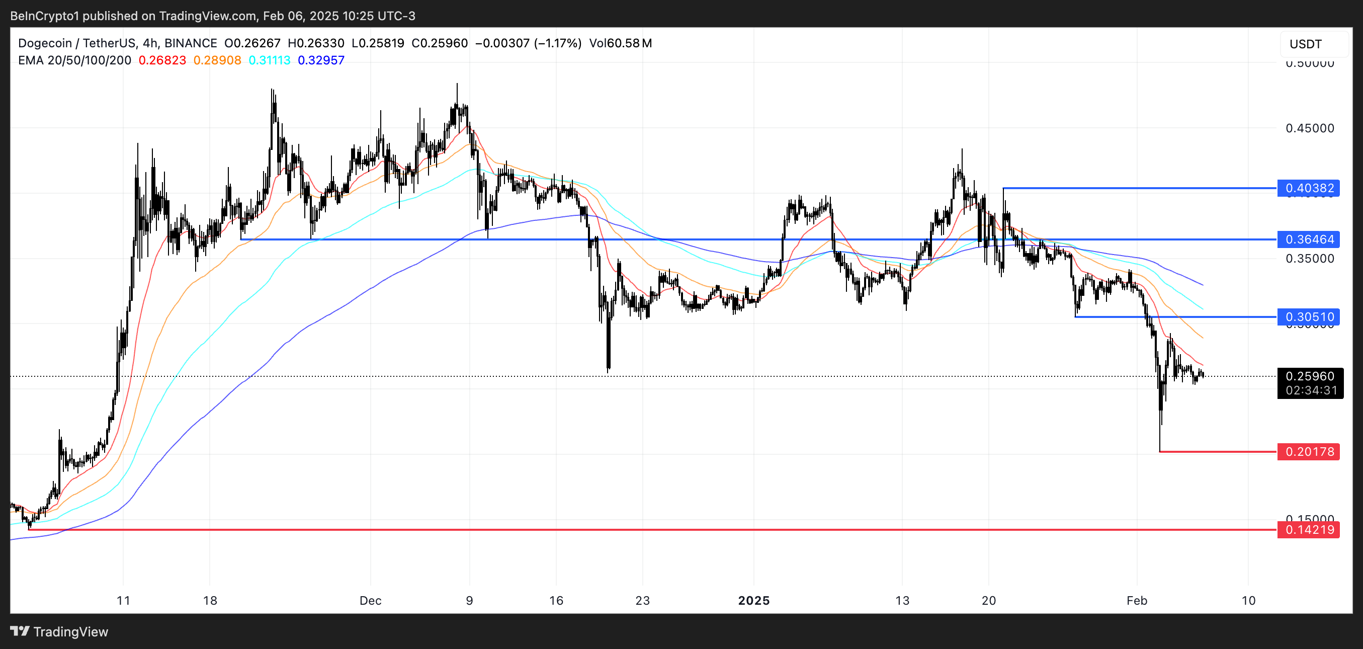 Jos laskeva suuntaus vahvistuu edelleen, DOGE hinta voisi nousta jopa 0,40 dollariin, mikä edustaisi potentiaalista 54 % nousua. Kunnes EMA:t siirtyvät kuitenkin härkämäisempään muodostelmaan, yleinen trendi pysyy karhumaisena.