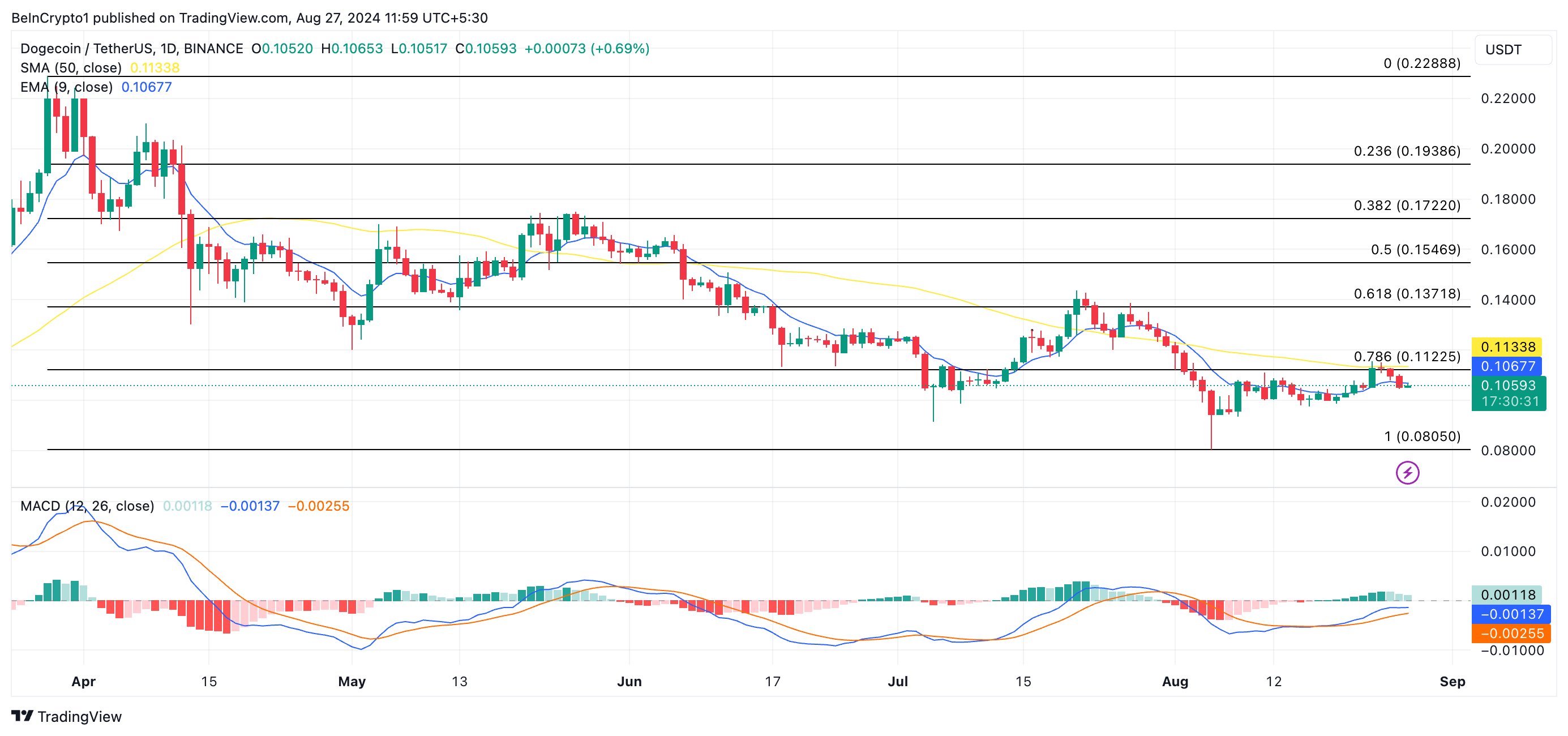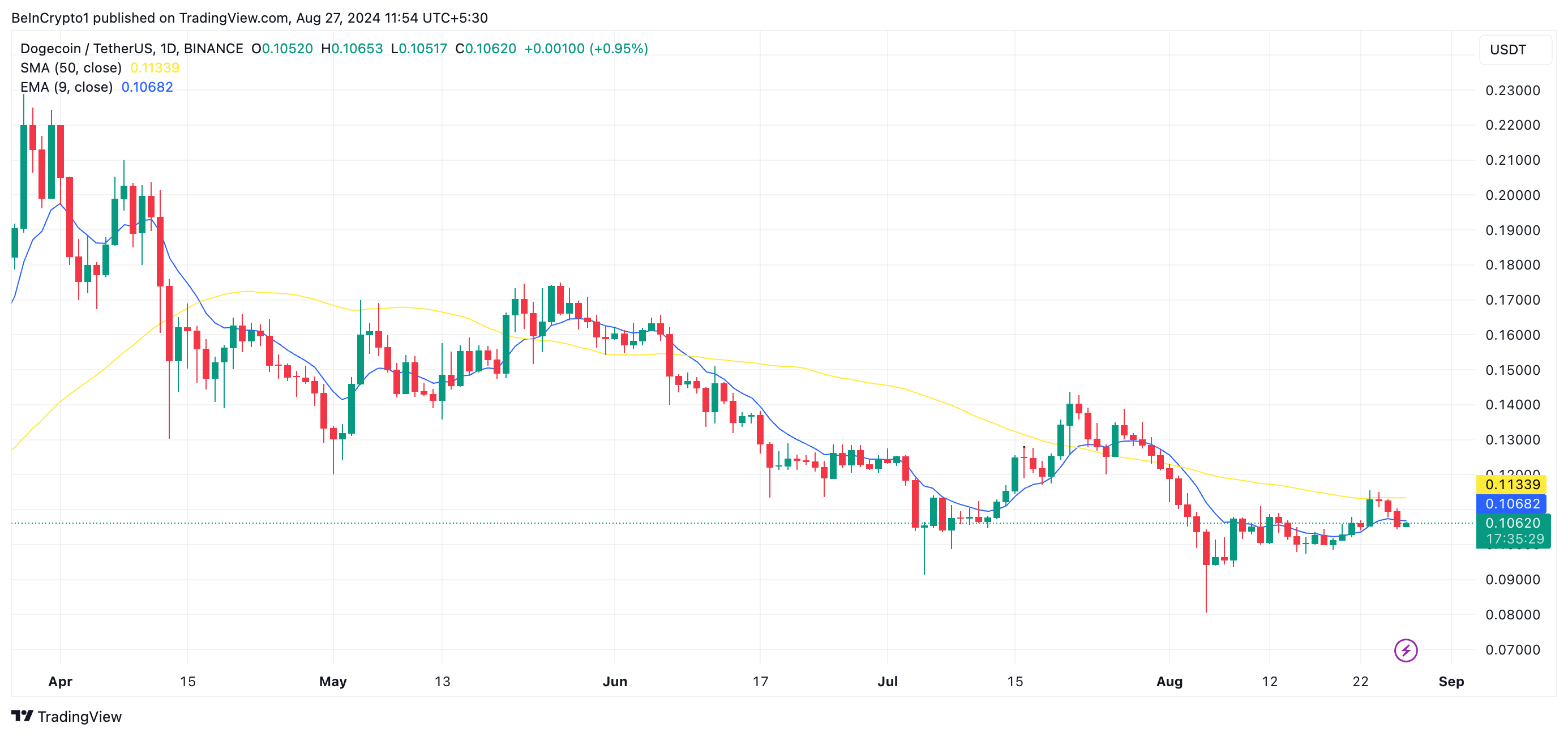 23. elokuuta DOGE yritti murtautua yli 50 päivän SMA:n, jonka hinta oli 0,11 dollaria, mutta kohtasi vahvan karhumaisen vastustuksen. Paine työnsi hinnan alaspäin, johtaen pudotukseen alle 20 päivän EMA:n maanantaihin mennessä.