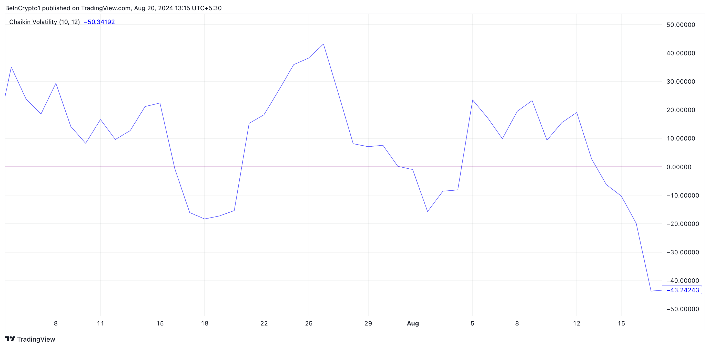 Samanlaisen trendin mukaisesti kolikon Chaikin Volatility on myös laskenut. Lehdistöhetkellä indikaattori on keskilinjansa alapuolella -43,24:ssä.