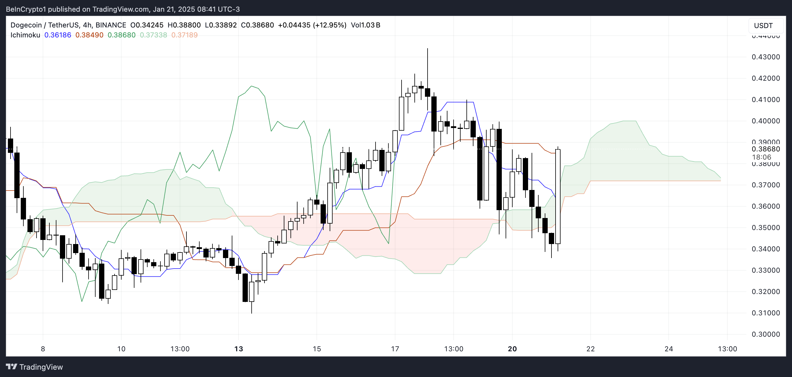 Ichimoku Cloud -kaavio DOGE:lle osoittaa sekalaista suuntausta. Tällä hetkellä hinta on sinisen Conversion Linen (Tenkan-sen) ja punaisen Base Linen (Kijun-sen) alapuolella, mikä viittaa lyhyen aikavälin karhumarkkinaan. Kuitenkin se on yhä vihreän pilven (Senkou Span A ja B) yläpuolella, mikä osoittaa, että DOGE-hinta pysyy laajemmassa härkämarkkinassa huolimatta viimeaikaisista notkahduksista.