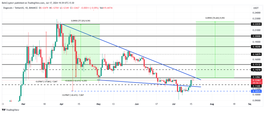 Dogecoinin hintakauppa 0,124 dollarissa tähtää yli 0,128 dollarin nousuun. Teknisesti tämä olisi merkki siitä, että DOGE huomaa potentiaalisen 74 prosentin nousun. Edellä mainitut tekijät huomioon ottaen näin ei kuitenkaan tapahdu.