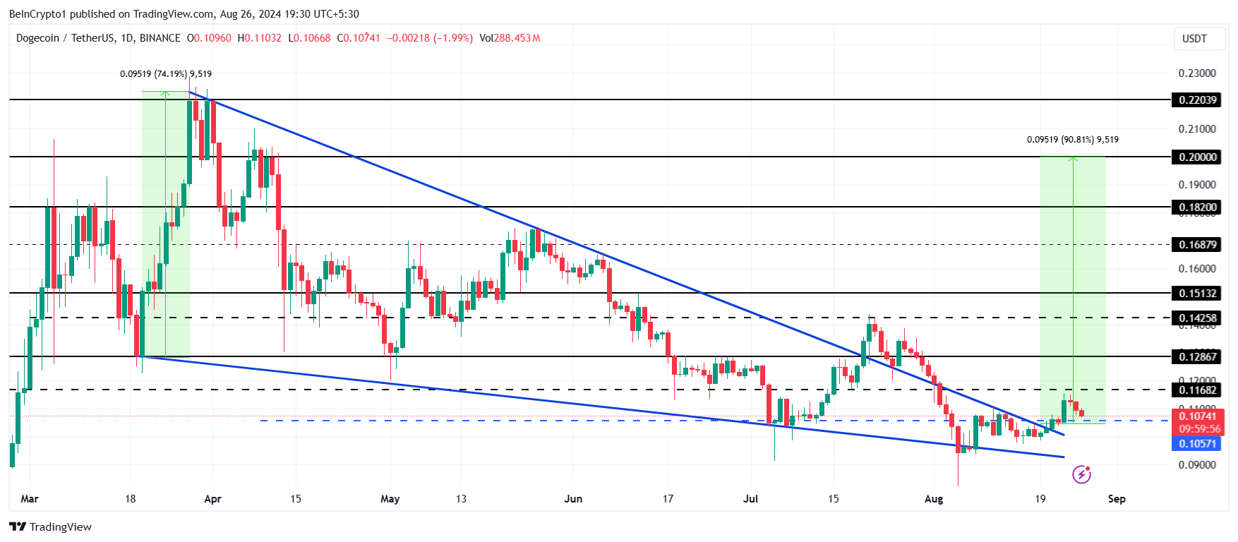 Vaikka meemikolikon odotetaan tuskin nousevan nopeasti, näyttää siltä, että jopa merkittävä nousu saattaa epäonnistua. Tämä johtuu siitä, että murtumisen jälkeen DOGE nousi 7 % 23. elokuuta ja on sen jälkeen laskenut. Näin ollen, 0,10 dollaria kaupankäynnin kohteena oleva altcoin saattaa päätyä konsolidoitumaan alle 0,11 dollarin.