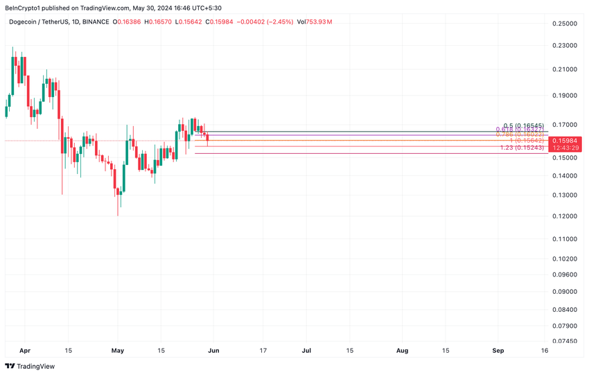 Lehdistöhetkellä Dogecoin (DOGE) vaihtoi omistajaa 0,15 dollarissa. Kolikon hinta nousi huippuunsa 0,17 dollariin 26. toukokuuta ja on sen jälkeen laskenut 12 %.