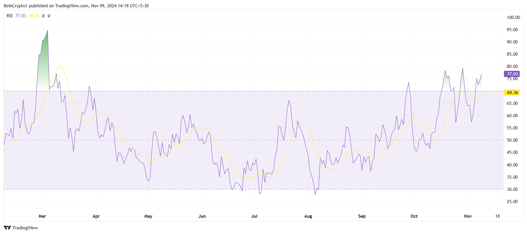 Dogecoinin makrovauhti, jota heijastaa suhteellinen voimaindeksi (RSI), osoittaa, että omaisuuserä on leijunut yliostetulla alueella yli 70,0. Vaikka tämä viestii vahvasta ostokiinnostuksesta, pitkittyneet oleskelut yliostetulla vyöhykkeellä voivat joskus johtaa korjausliikkeisiin. Vaikka tällä hetkellä ei ole välitöntä kääntymisen uhkaa, Dogecoinin RSI-taso viittaa siihen, että varovaisuus voi olla perusteltua.