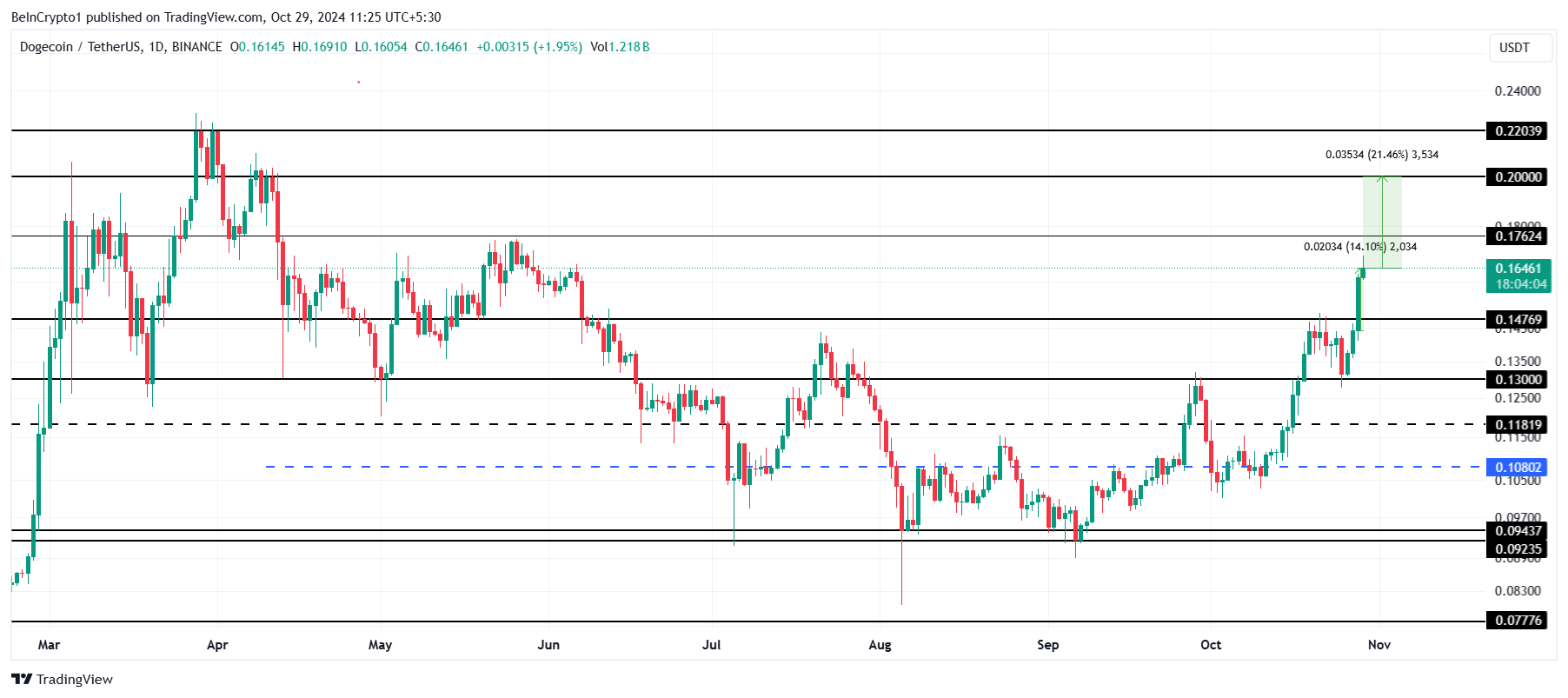 Jos DOGE ei pysty ylittämään 0,17 dollarin vastusta, voi tapahtua palautuminen 0,14 dollariin, mikä haastaisi härkämäisen näkemyksen. Tämä lasku pidentäisi DOGE:n polkua korkeampiin hintatasoihin, mikä viestii tarpeesta uudelle vauhdille palauttaakseen nousutrendin.