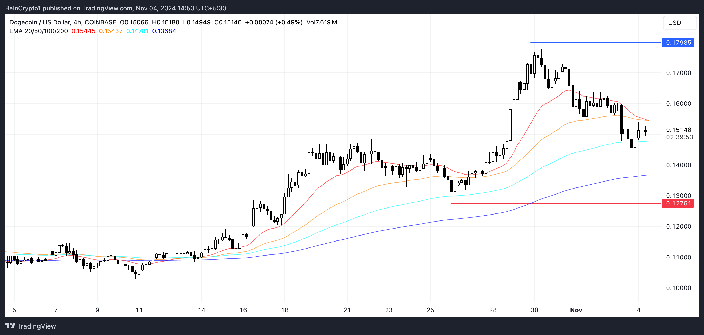 Kuitenkin, jos suuntaus kääntyy ja DOGE siirtyy nousutrendiin, se saattaa yrittää testata aiemman vastuksensa 0,179 dollaria, mikä edustaisi mahdollista 18,5 %:n hinnannousua.