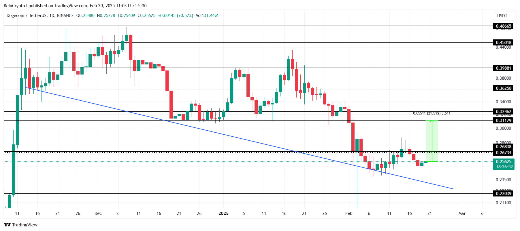 Jos DOGE jatkaa nousuaan, hinta voi nousta jopa 21 %, jolloin 0,31 dollaria muodostuu kriittiseksi tukitasoksi jatkuvalle hintarallille. Tämä merkitsisi vahvaa palautumista Dogecoinille, asettaen sen kohti lisänousua 0,40 dollariin.