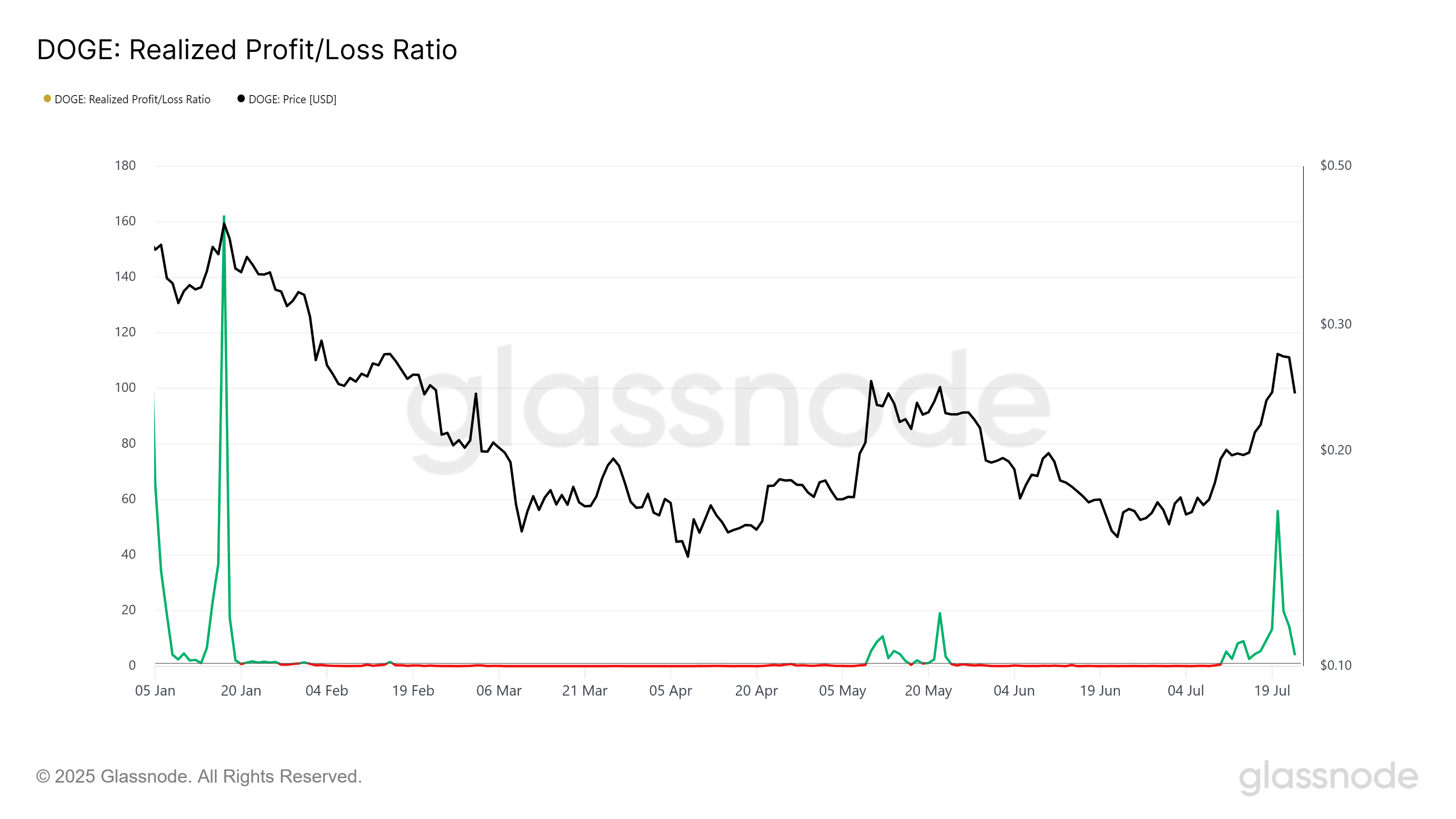 Tällä viikolla Dogecoinin toteutunut voitto/tappio-suhde nousi merkittävästi edellisen viikon hintarallin jälkeen. Voittojen kotiuttaminen saavutti 6 kuukauden huipun, mikä viittaa siihen, että monet sijoittajat päättävät kotiuttaa voittonsa. Nämä voittojen kotiuttajat menettävät todennäköisesti luottamuksensa Dogecoinin potentiaaliin lisähinnan nousulle, mikä saa heidät poistumaan markkinoilta.