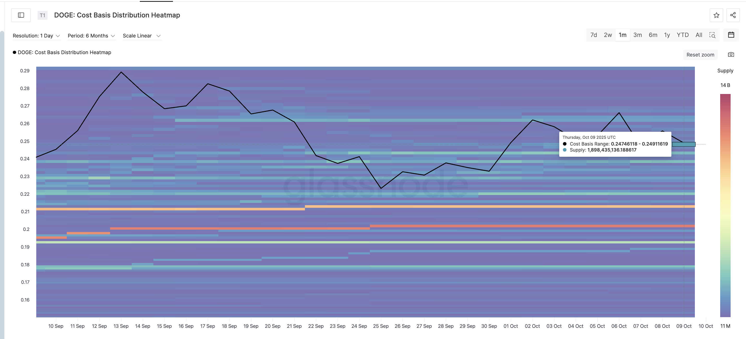 Glassnoden kustannusperusteiden jakautumisen lämpökartta — joka visualisoi, kuinka paljon tarjontaa on eri hintatasoilla — korostaa, miksi Dogecoinin hinta on välttänyt suuria heilahteluja.