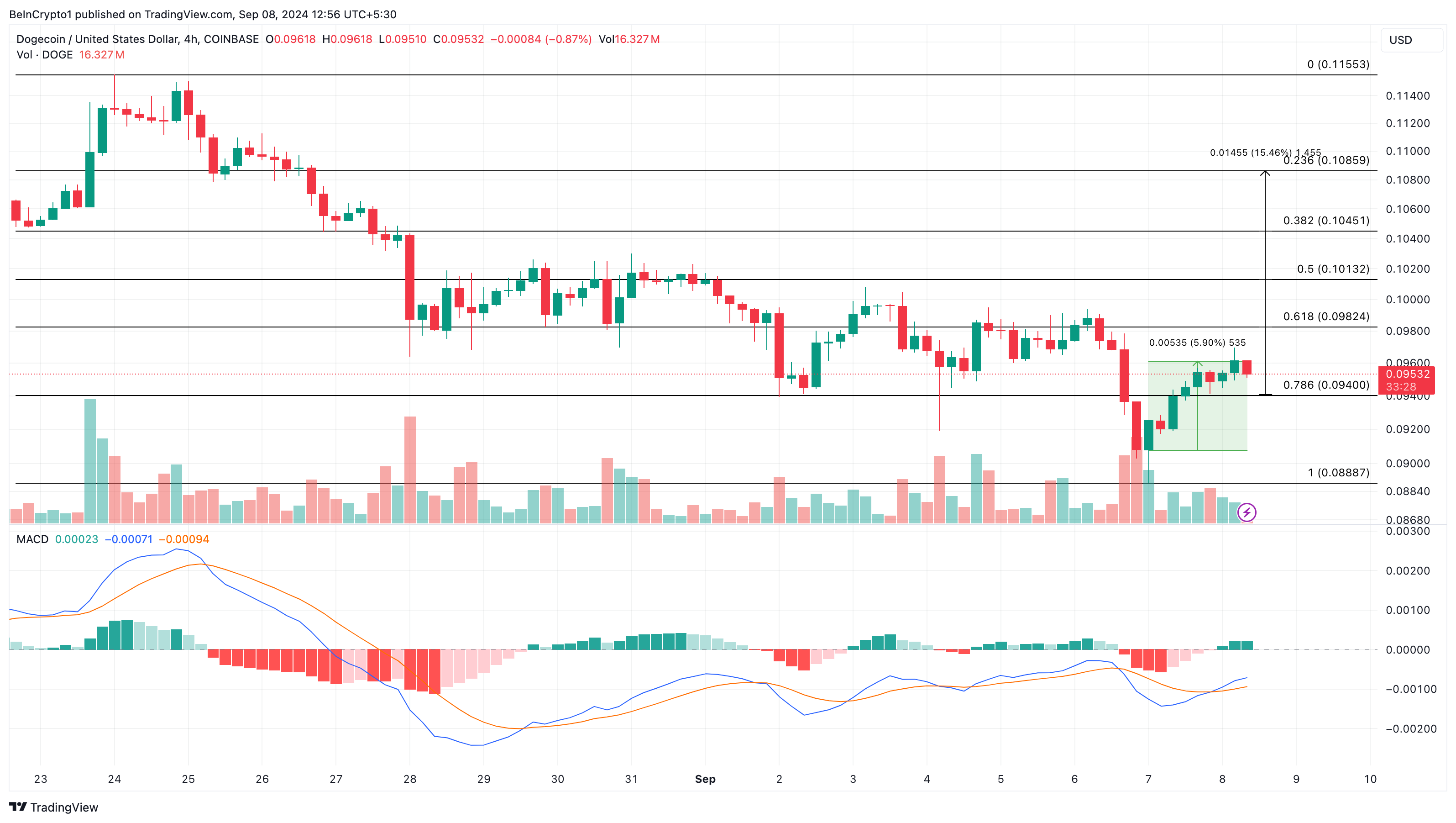 4 tunnin Dogecoin-kaavion mukaan meemikolikon hinta nousi 0,090 dollarista 0,096 dollariin Elon Muskin viestin jälkeen. Vaikka se on hieman palautunut 0,095 dollariin, liikkuva keskiarvojen konvergenssi ja divergenssi (MACD) vihjaa, että se voisi nousta korkeammalle.