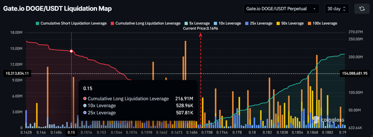 Likvidointikartta paljastaa, että noin 216 miljoonan dollarin arvoiset pitkät positiot voivat kohdata likvidoinnin, jos Dogecoinin hinta laskee 0,150 dollariin. Tämä hinta ei ole kaukana sen nykyisestä kriittisestä 0,164 dollarin tuesta.