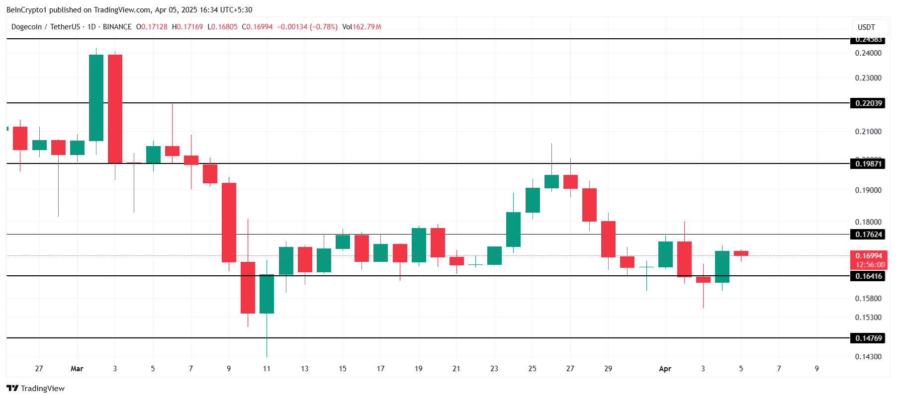 Kirjoitushetkellä Dogecoinin hinta on 0,169 dollaria, juuri kriittisen 0,164 dollarin tuen yläpuolella. Altcoin ei ole pystynyt murtamaan 0,176 dollarin vastustusta useisiin päiviin, mikä osoittaa pysähtyneisyyttä.