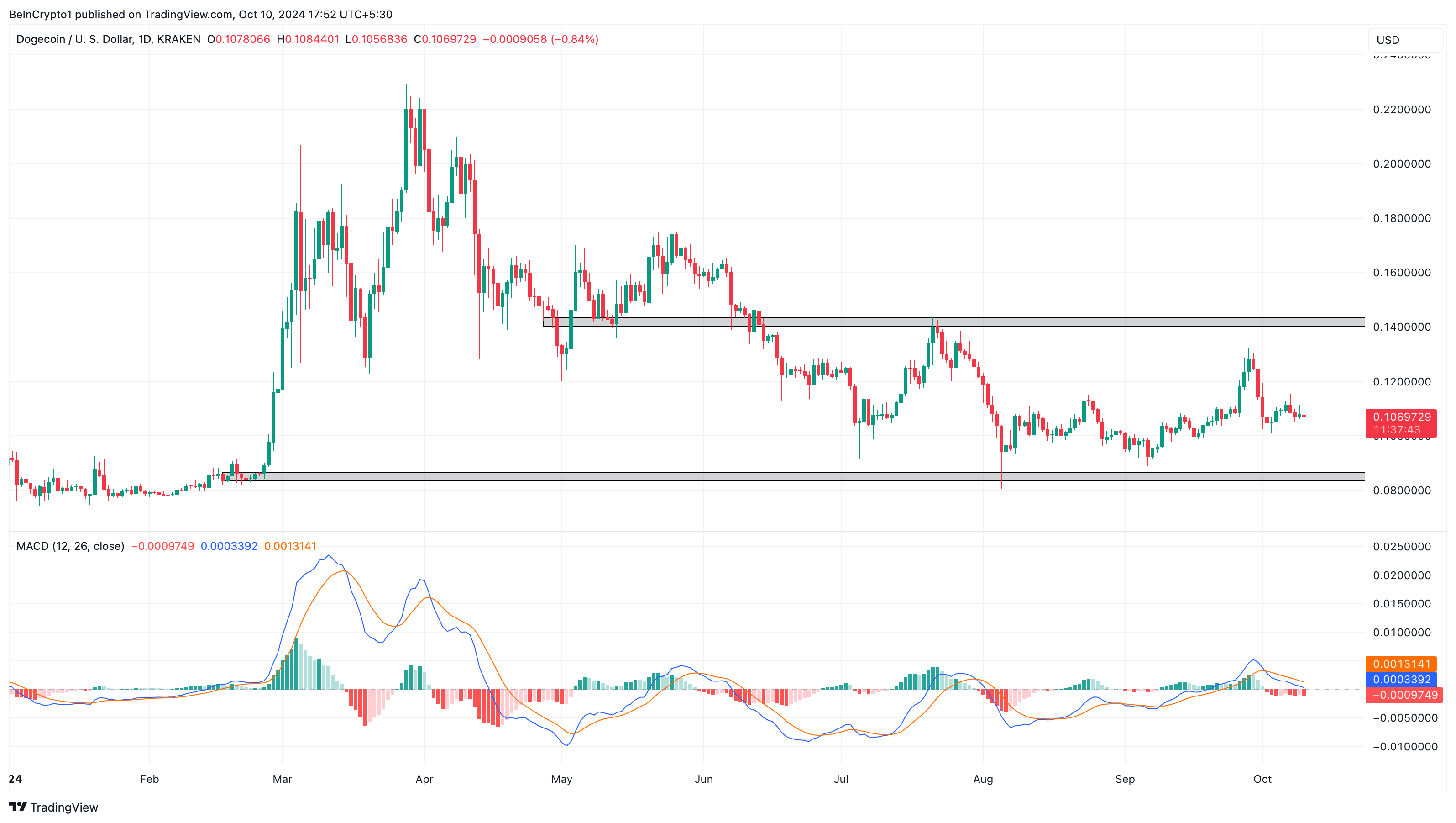 Mitä tulee seuraavaan liikkeeseen, DOGE näyttää melkein varmasti putoavan alle 0,10 dollarin. Yksi syy on sen liikkuva keskiarvojen konvergenssi-eroavaisuus (MACD), joka käyttää kahden eksponentiaalisen liikkuvan keskiarvon (EMA) trendiä mittatakseen momenttia.