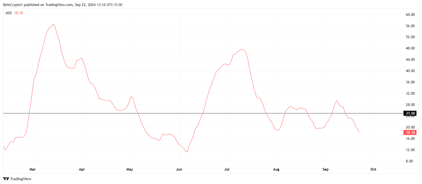 Dogecoinin makrotaloudellinen liikehdintä paljastaa heikkouden merkkejä, erityisesti kun analysoidaan teknisiä indikaattoreita kuten Keskimääräinen Suuntausindeksi (ADX). ADX osoittaa, että DOGEn aktiivinen nousutrendi on menettänyt voimansa ja on nyt erittäin heikko. Heikko ADX yleensä merkitsee, että kryptovaluutta kamppailee ylläpitääkseen nousumomenttia, mikä tekee DOGEn tilanteen vaikeaksi ylläpitää mitään härkämäisiä voittoja.