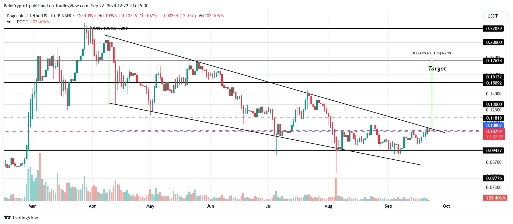 Dogecoin käy tällä hetkellä kauppaa 0,107 dollarin hintaan ja on lähellä läpimurtoa laskevasta kiilasta. Vaikka tämä asetelma perinteisesti viittaa 60 %:n ralliin 0,176 dollariin, läpimurto ei ehkä tapahdu niin nopeasti kuin odotettiin.
