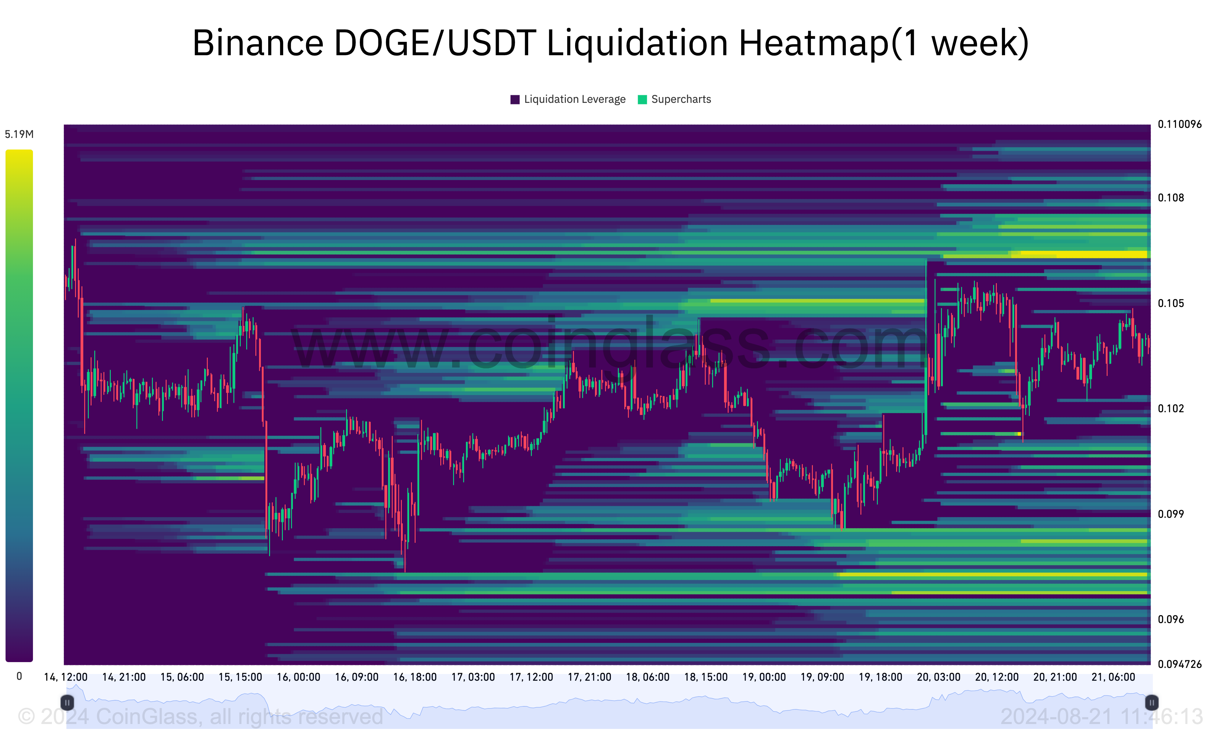 Likvidointilämpökartta on toinen indikaattori, joka viittaa siihen, että Dogecoin saattaa kohdata vaikeuksia. Tämä lämpökartta ennustaa hintatasoja, joilla suuren mittakaavan likvidointi saattaa tapahtua. Kontekstiksi, likvidointi tapahtuu, kun pörssi sulkee pakolla avoimen position riittämättömän marginaalitaseen vuoksi ja estääkseen lisätappiot.