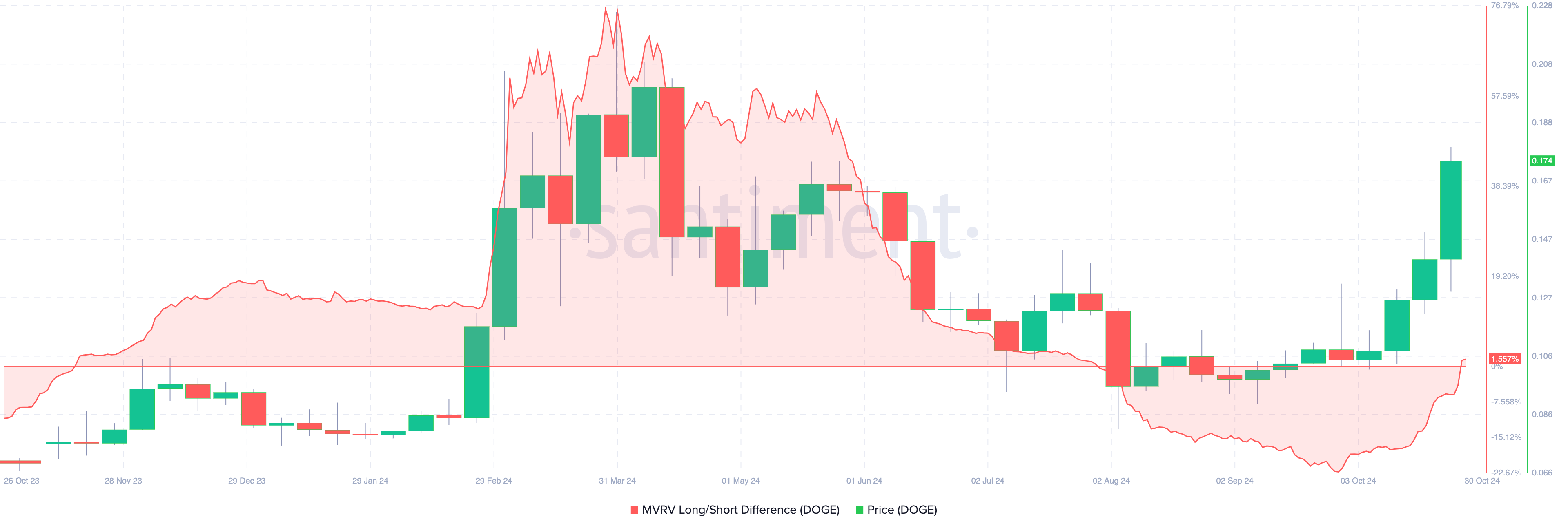 Santimentin mukaan tämä saattaa olla vasta alkua rallille, joka on samankaltainen kuin DOGE:n nousu 0,22 dollariin maaliskuussa. Yksi avaintunnusluvuista, joka mahdollisti tuon nousun, oli Market Value to Realized Value (MVRV) pitkän ja lyhyen aikavälin ero.