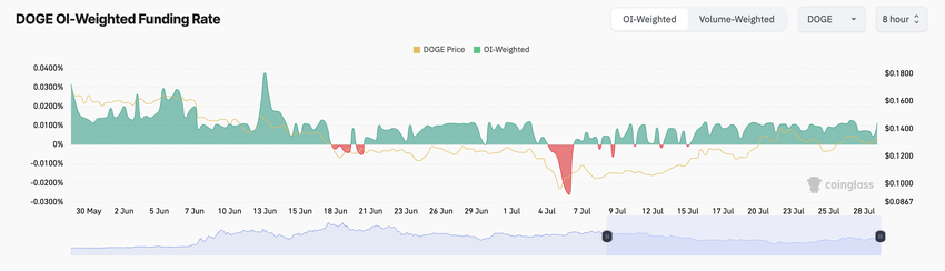 Härkämäinen suuntaus DOGE:ssa on myös läsnä sen futuurimarkkinoilla. Tämä näkyy sen rahoitusasteessa kryptovaluuttapörsseissä, joka on pysynyt positiivisena heinäkuun 14. päivästä lähtien. Kirjoitushetkellä meemikolikon rahoitusaste on 0.011%.