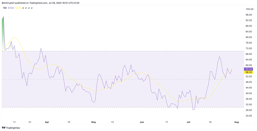 Meemikolikon nouseva suhteellinen vahvuusindeksi (RSI) vahvistaa tämän mahdollisuuden. Tätä kirjoitettaessa DOGE:n RSI on 57.59, mikä viittaa jatkuvaan nousuun ostovoimassa.