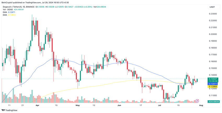 Johtavan meemikolikon Dogecoinin (DOGE) hinta saattaa nousta kuukauden korkeimpaan, kun sen 50 päivän eksponentiaalinen liukuva keskiarvo (EMA) on ylittämässä sen 200 päivän EMA:n.