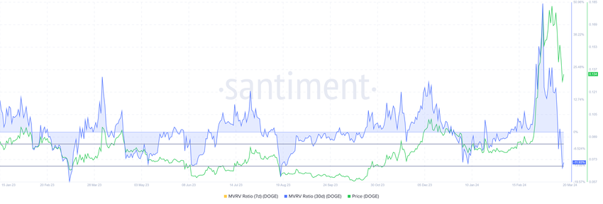 Tämä johtuu siitä, että DOGE:n markkina-arvon ja toteutuneen arvon (MVRV) suhde viittaa siihen, että kryptovaluutta on kypsä poimittavaksi. MVRV-suhde vertaa kryptovaluutan markkina-arvoa sen toteutuneeseen markkina-arvoon, mikä osoittaa, ovatko varat yli- vai aliarvostettuja.