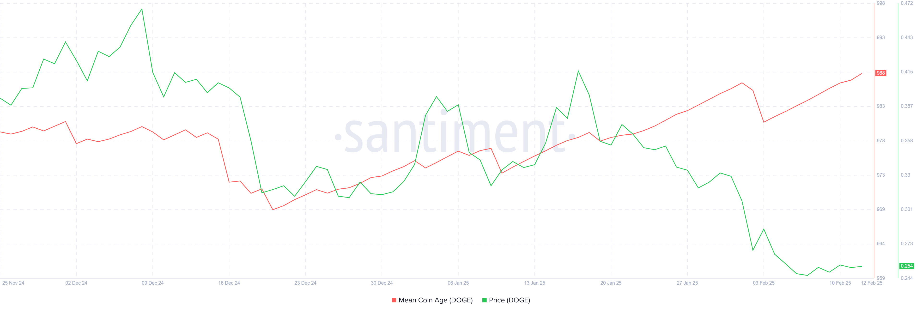 Mean Coin Age (MCA) -indikaattori osoittaa huomattavaa nousua, mikä viittaa siihen, että pitkäaikaiset haltijat pidättäytyvät likvidoimasta DOGE:aan. Sen sijaan nämä sijoittajat pitävät asemansa, mikä on hyvä merkki Dogecoinin hinnan vakaudelle. Heidän jatkuva pitämiskäyttäytymisensä viittaa siihen, että he ovat luottavaisia mahdolliseen palautumiseen.