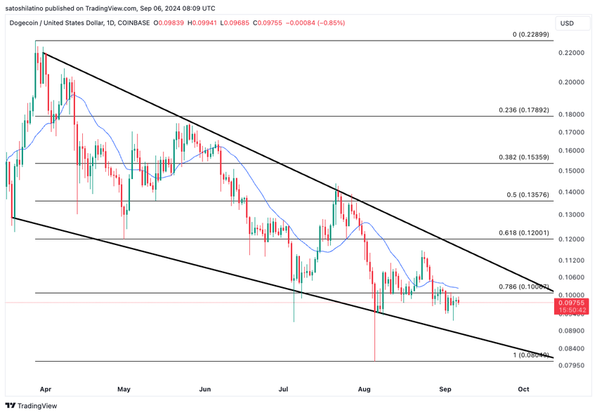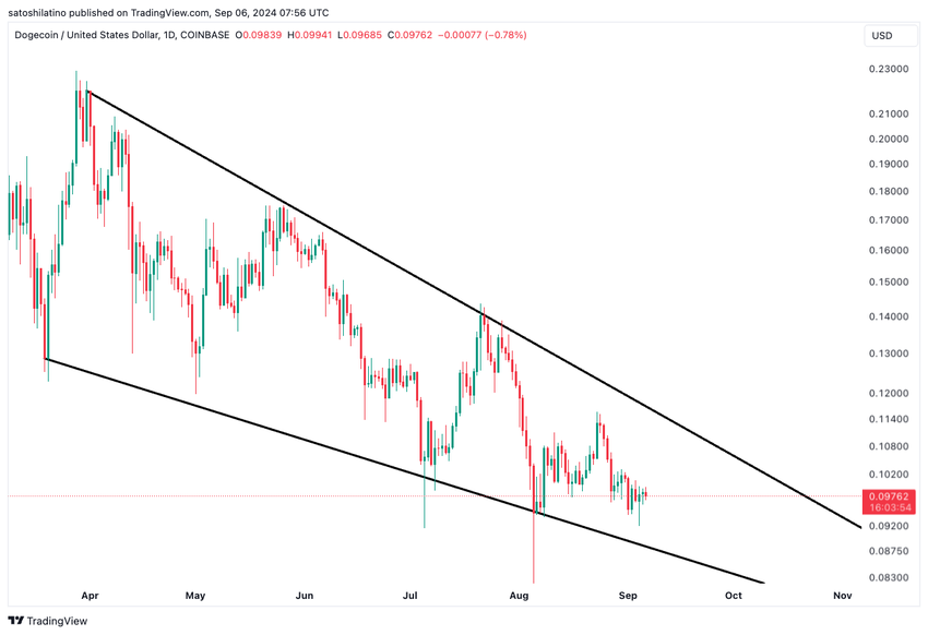 Dogecoin on kaupankäynnin kohteena ollut laskevassa kiilakuviossa maaliskuusta lähtien. Kuvio muodostuu, kun omaisuusvaran hinta liikkuu kahden alaspäin suuntautuvan trendilinjan välissä. Ylempi trendilinja toimii vastustasona, kun taas alempi trendilinja toimii tukena.