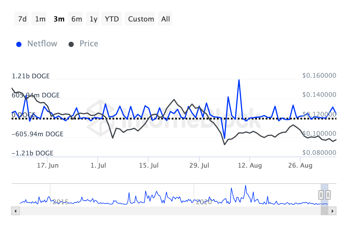IntoTheBlockin tiedon mukaan DOGE:n suurten omistajien nettovirta—tunnusluku, joka seuraa valaiden ostamien ja myytyjen kolikoiden eroa—on laskenut 47 % viimeisen 90 päivän aikana.