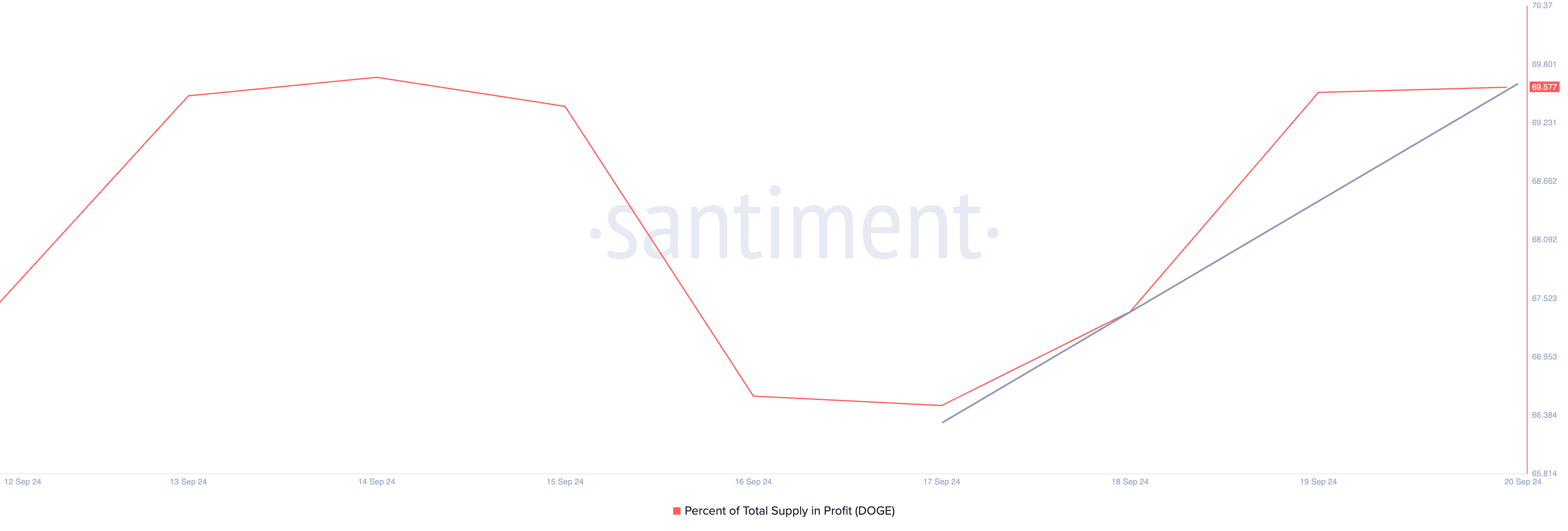 DOGE:n hintarallin vuoksi sen liikkeessä olevan määrän osuus, joka on voitollinen, on noussut. Santimentin tiedot osoittavat, että 102 miljardia DOGE:a, joka edustaa 70 % meemikolikon liikkeessä olevasta 146 miljardin DOGE:n määrästä, on nyt voitollista. Vertailun vuoksi vain 97 miljardia kolikkoa oli voitollisia neljä päivää sitten.