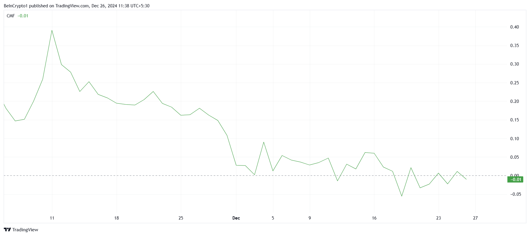 Dogecoinin Chaikin Money Flow (CMF) -indikaattori on lähellä neutraalia linjaa, mikä viittaa vähäisiin sijoituksiin markkinoille. Tämä viittaa siihen, että sijoittajat pysyvät varovaisina, mahdollisesti laajempien markkinaolosuhteiden epävarmuuden tai DOGE:n kiinnostuksen hiipumisen vuoksi.