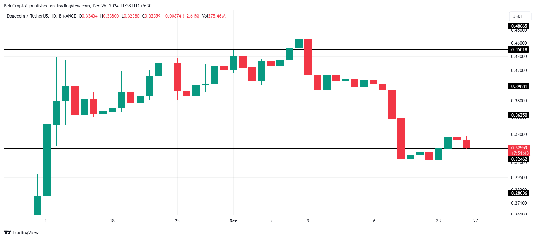 Dogecoin on tällä hetkellä hinnaltaan 0,32 dollaria, taso, jota se yrittää vakiinnuttaa tukilattiaksi. Tämän tason varmistaminen on ratkaisevaa meemikolikon toipumiselle sen viimeaikaisesta 32 %:n romahduksesta 0,46 dollarista. Tuen säilyttäminen voisi viitata mahdolliseen käänteeseen sijoittajien tunnelmassa.