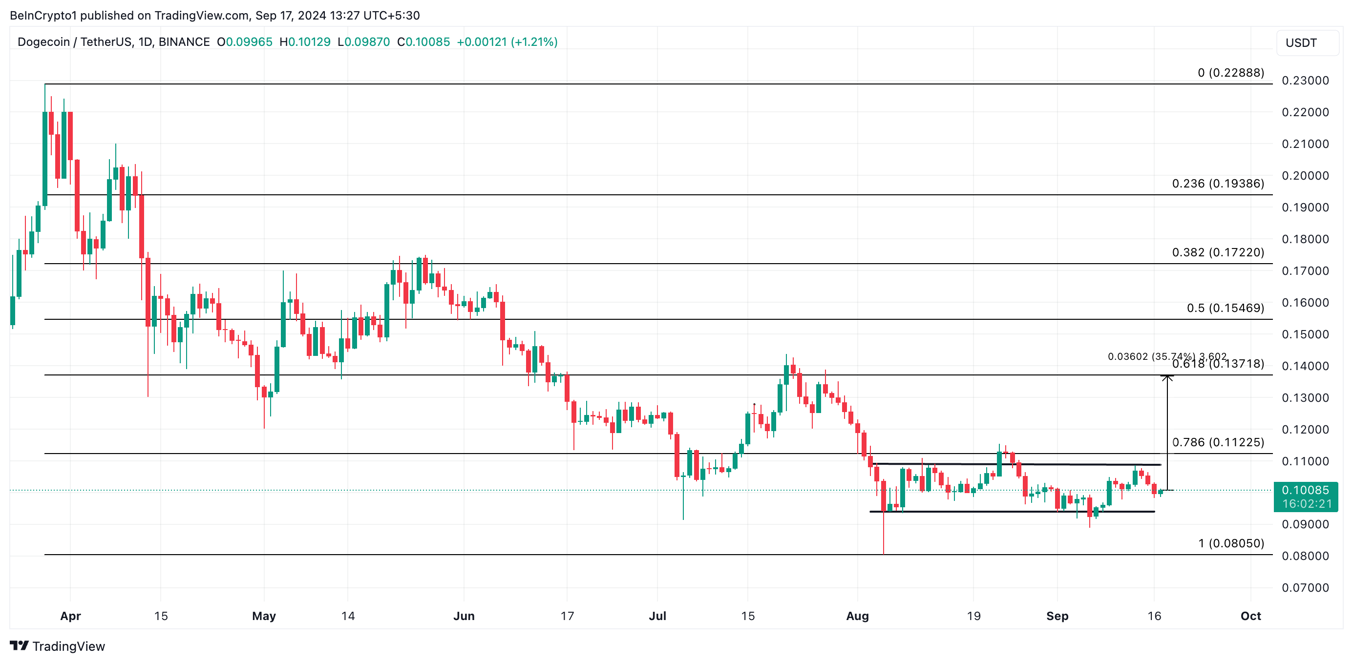 Huolimatta ostotoiminnan lisääntymisestä viimeisen kuuden viikon aikana, kuten keskeiset tunnusluvut, kuten Chaikin Money Flow (CMF), joka on ollut nousutrendissä syyskuun alusta lähtien ja on nyt 0,16, mikä viittaa likviditeetin virtaukseen markkinoille, DOGE on ylittänyt 0,10 dollarin vastuksen vain kahdesti.