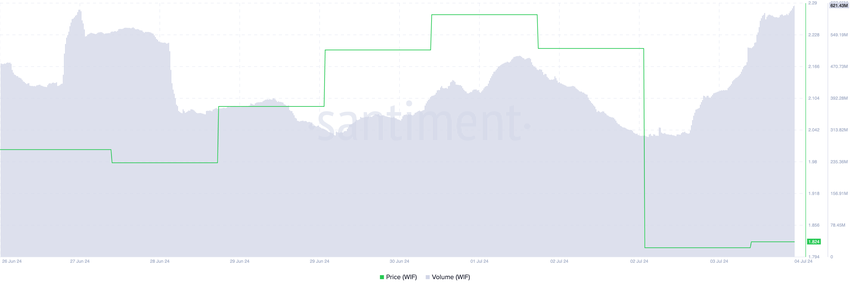 Huolimatta WIF:n hinnan laskusta viimeisen 24 tunnin aikana, sen kaupankäyntivolyymi on noussut, ollen lehdistöhetkellä yhteensä 621 miljoonaa dollaria, ja se on noussut 101% tarkastelujakson aikana.