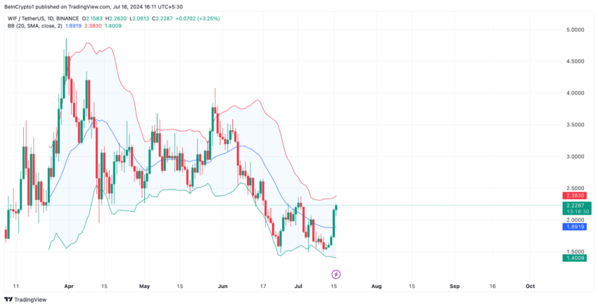 WIF:n kaksinumeroinen hinnannousu viimeisen seitsemän päivän aikana on lisännyt markkinoiden volatiliteettia. Tämä voidaan havaita sen ylemmän ja alemman Bollinger Bands -indikaattorikaistan välisestä laajenevasta raosta.
