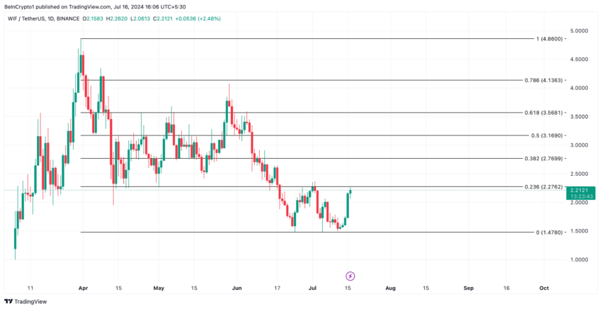 Jos WIF jatkaa nousutrendiään, sen arvo on 2,27 dollaria. Tämä on 23,6%: n Fibonacci-retracement-tasolla. Tätä tasoa pidetään heikoimpana retracement-tasona, ja WIF saattaa vetäytyä hieman ylöspäin siirtymisen jälkeen.
